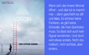 Ich liebe Ihr Magazin. Durchaus. Es ist mir eine überaus große Freude immer wieder einen Blick in die Lektüre zu werfen. Deshalb habe ich Ihr Magazin auch noch einmal in Papierformat abonniert, um es liegen lassen zu dürfen, damit es mit meinen Gedanken atmen kann.