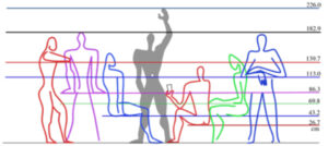 The sides of a pentagram intersect each other in the golden ratio. An ideally proportioned person has the golden ratio within them. If you divide their body height accordingly, you end up at the navel. If a person stretches their hand upwards, their fingertips are twice the height of their navel. The architect Le Corbusier used these measurements, based on a person with a height of 6 feet, as the starting point for his Modulor series, which he used to proportion his buildings. The navel height, divided by the golden ratio, results in an ideal table height. Divided again, an ideal seat height. Le Corbusier also used the golden ratio to find room heights and window dimensions. Everything then bears human scale, people thus resonate – with the whole. “By means of the forms [the architect] intensely touches our senses and awakens our feeling for the design. The connections he creates resonate deeply with us, he shows us the scale for an order that is perceived as being in harmony with the world order.“[1]